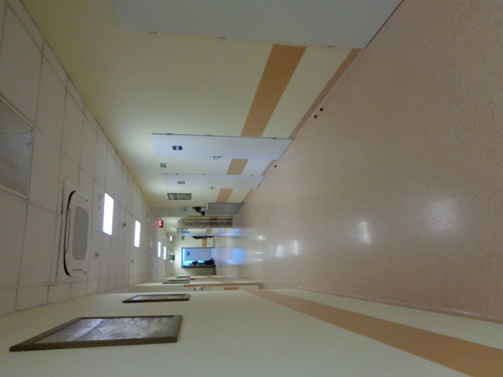 Korytarz Oddziału, wykładzina na podłodze w pomarańczowym kolorze, ściany żółte
