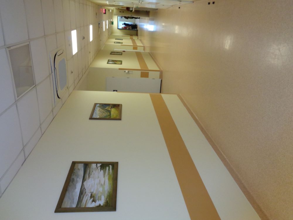 Korytarz Oddziału w kolorze żółtym, pomarańczowa wykładzina na podłodze
