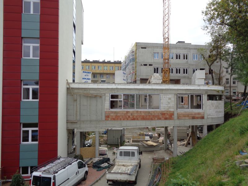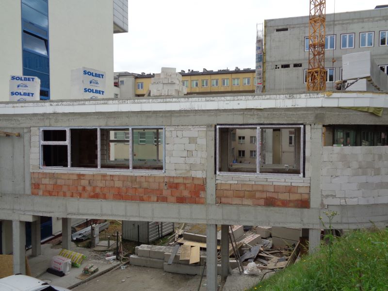 Prace wykonane w miesiącu sierpniu: Laboratorium: częściowo pokrycie dachowe, ściany działowe z płyt kartonowych i gipsowych, tynkowanie i licowanie ścian, podłoża i posadzki, stolarka i ślusarka budowlana. Rozpoczęto prace związane z elewacją i dociepleniem budynku. W części Łącznika trwają dalsze prace przy konstrukcjach żelbetowych, pokryciu dachowym, stolarce i ślusarce budowlanej a także instalacjach elektrycznych. Prace końcowe przy instalacji wentylacji na piętrze 3 oraz częściowo na dachu. Instalacje wod.-kan.-p.poż. - dalsze etapy.