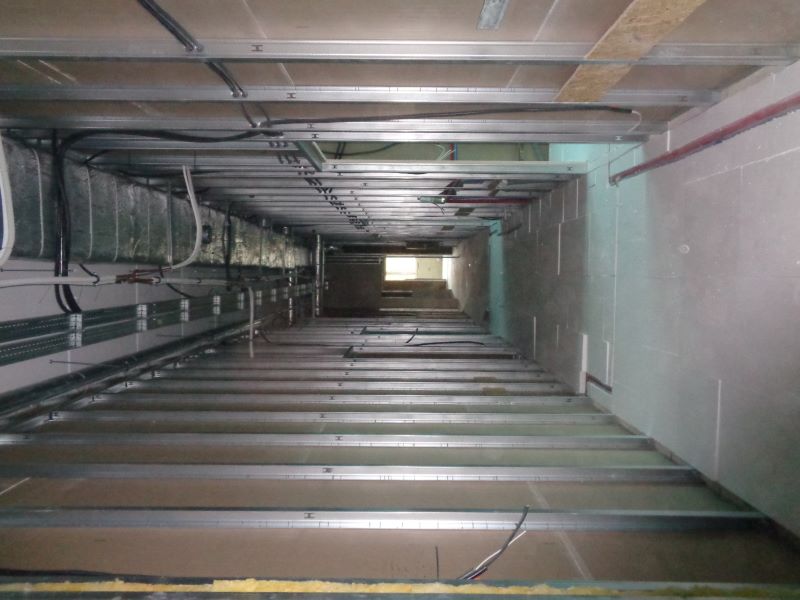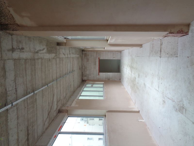 Prace budowlane wewnątrz nowego budynku. Widok na korytarz.