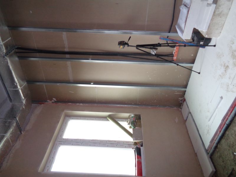Prace budowlane wewnątrz nowego budynku. Widok na wykonane ściany i instalację.