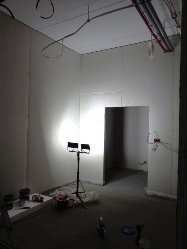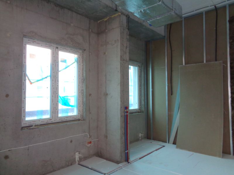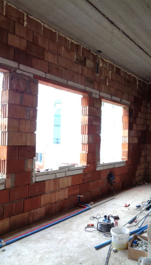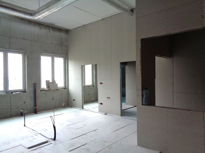 Prace budowlane wewnątrz nowego budynku. Widok na ściany działowe.