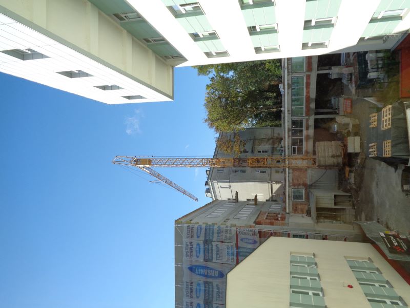 Widok na powstający budynek pomiędzy już istniejącymi budynkami.