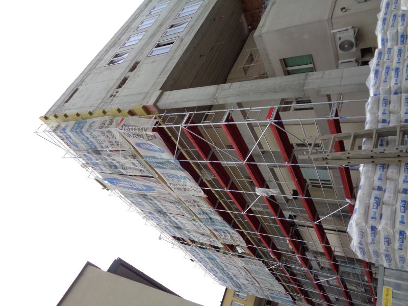 Widok na rusztowania przygotowane do ocieplania budynku.