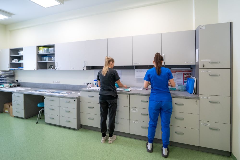 Pokój zabiegowy, dwie pielęgniarki przygotowujące leki