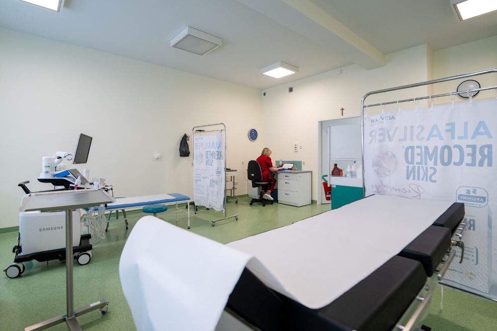 Pokój zabiegowy, na środku kozetka, w lewym rogo pielęgniarka przy biurku