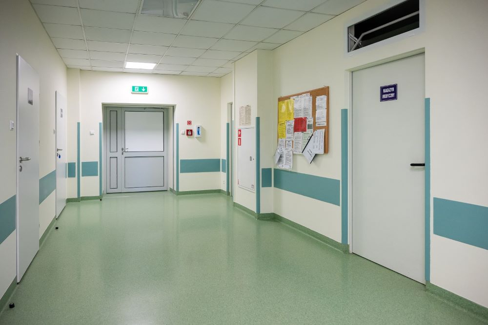Korytarz Oddziału w kolorze zielonym, na końcu duży kwiatek w doniczce