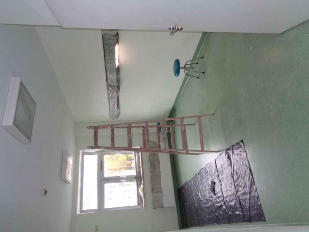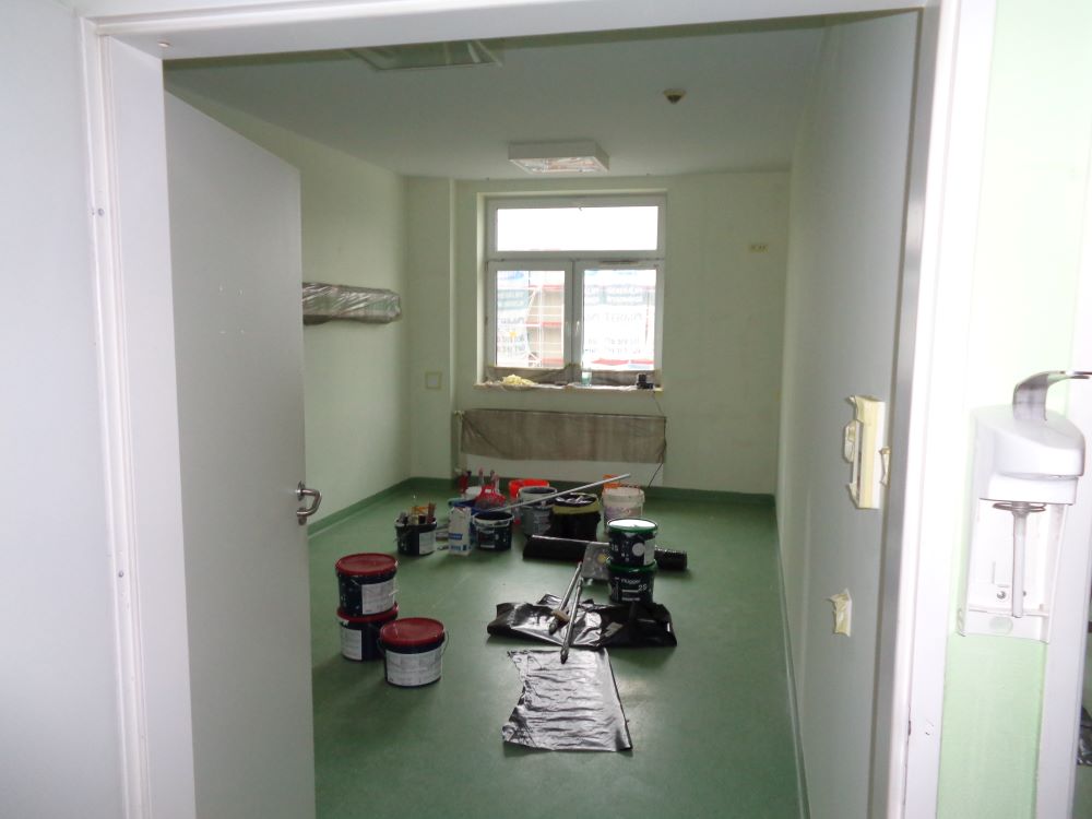Sala chorych, na środku podłogi sprzęt oraz wiadra z farbami