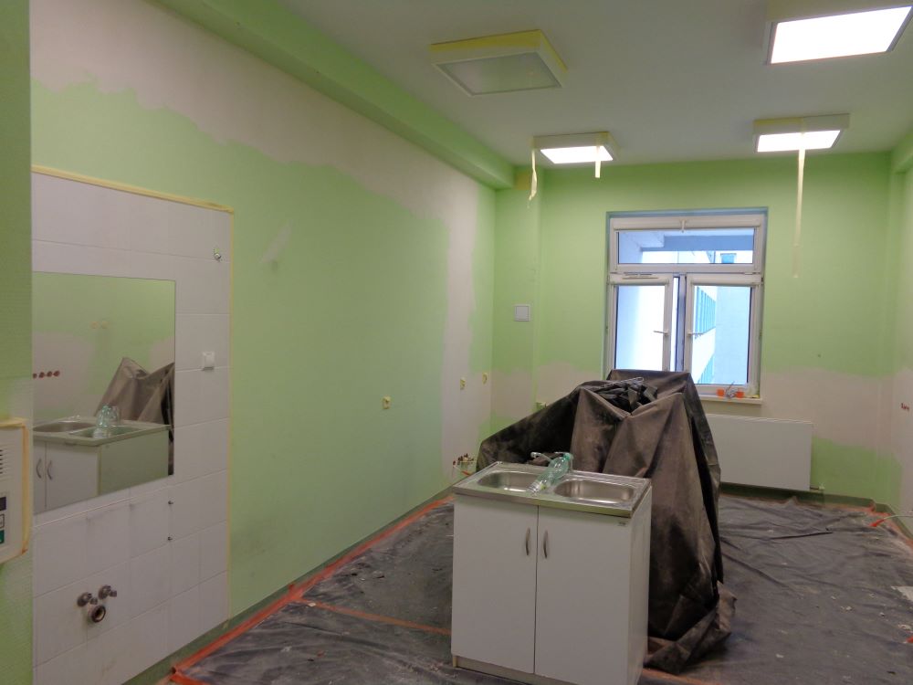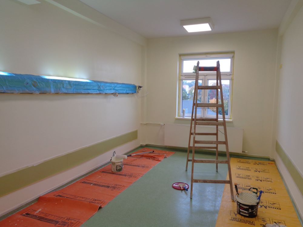 Korytarz oddziału, na ziemi ułożone wiadra z farbami